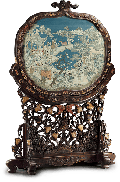 此插屏为石榴形,木制边框,嵌有各色染牙雕刻出的团寿、蝙蝠、卍字形纹饰,屏心以缂丝工艺展示众多孩童在宛如仙境的地方嬉戏的场景,底座镂雕仙桃、佛手众枝交错,并以玉石镶嵌,取福寿的寓意。众多婴孩的题材多称为百子图,戏耍、舞龙、读书、弹琴等形象不一,常用来表示子孙繁衍,家族兴旺。