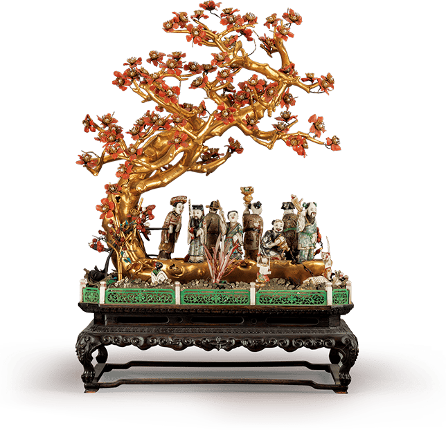 此盆景以梅花树为主景,树干为木制,表面涂金漆,花瓣以料石、珍珠制作而成,底部呈槎形。八仙环布,何仙姑握橹使船前行;其余仙人手持法器,神态各异。四周用珊瑚等料模拟海水、植物,因海水翻涌而出来查看的精怪藏于其中。