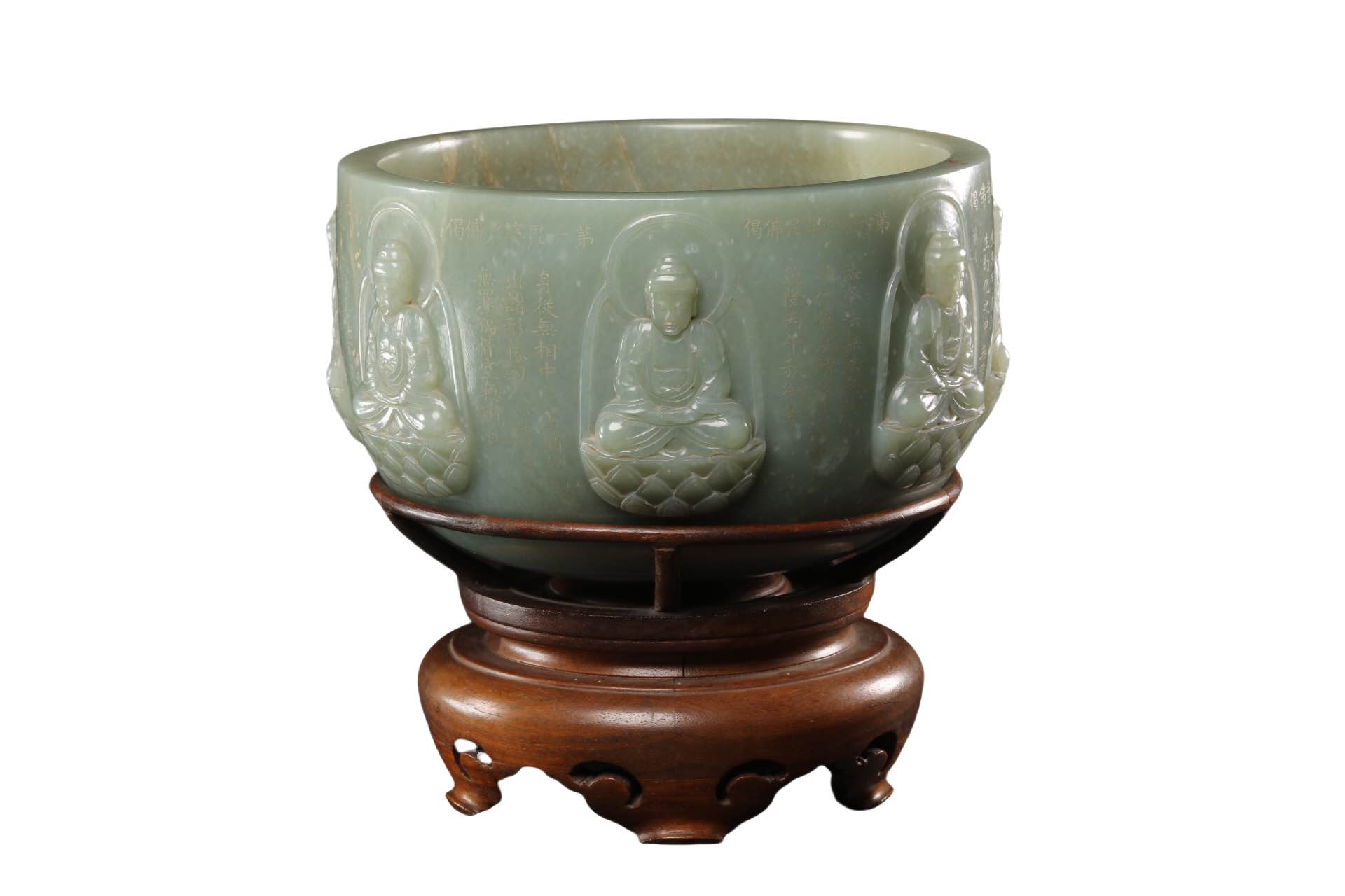青玉质。玉质温润,色泽淡雅。器呈圆形,口 微内敛,体型厚重。据考,乾隆二十二年(1757年),帝南巡至苏州,见开元寺所供佛钵,大为赞赏,后命良工仿制成玉钵,供于宫内佛堂中。玉钵腹部浮雕一周七尊佛像,其间镌刻每尊佛的佛号、佛谒。据《长阿含经》载七佛为毗婆尸佛、尸弃佛、毗舍婆佛、拘楼孙佛、拘那含佛、迦叶佛及释迦牟尼佛。佛像均为结跏趺坐,双手叠至膝上,眼帘低垂,宝相庄严。其背光为浅浮雕,佛像为高浮雕,恰到好处的突显了纹饰的立体感。