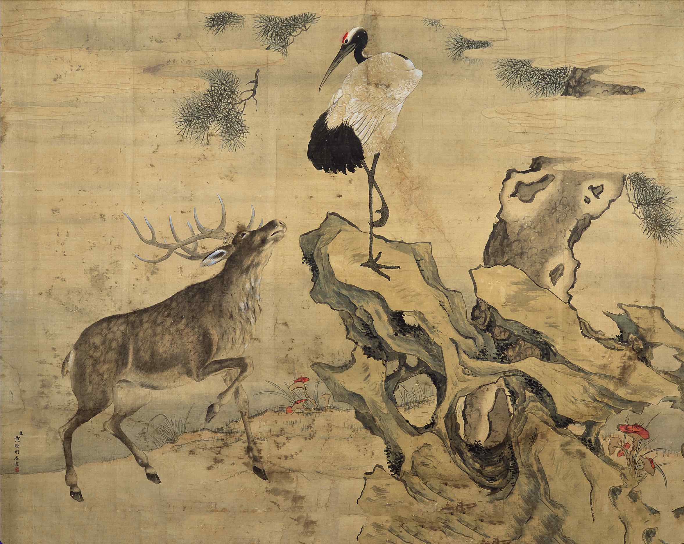 图中云雾缭绕,松树在云间若隐若现,灵芝在洞石间丛生,雄鹿昂首阔步,仙鹤立于嶙峋洞石上回首与其对视。画面整体虚实变化得当,造型准确,仙鹤闲适安详,雄鹿动感十足,鹤、鹿形成动与静的对比。鹤鹿同春的题材,鹤为仙禽,鹿为瑞兽,它们的形象自古以来被认作是长寿的象征,也具有“国泰民安”和“吉祥如意”的寓意。