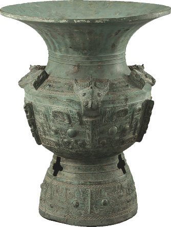 青铜质地,属大敞口有肩三段式尊。敞口,颈内收,广肩,鼓腹,圈足。肩部底纹饰云雷纹、兽面纹及三道突出扉棱,并铸有三尊牛角兽面立体浮雕。腹部主饰大面积兽面纹和扉棱。圈足上带有“十”字孔,饰弦纹、兽面纹。此器敦厚,通体绿锈,纹饰庄肃而神秘,是颐和园藏文物中的精品。青铜尊作为盛酒器、礼器,始于商代早中期,盛行于商和西周。