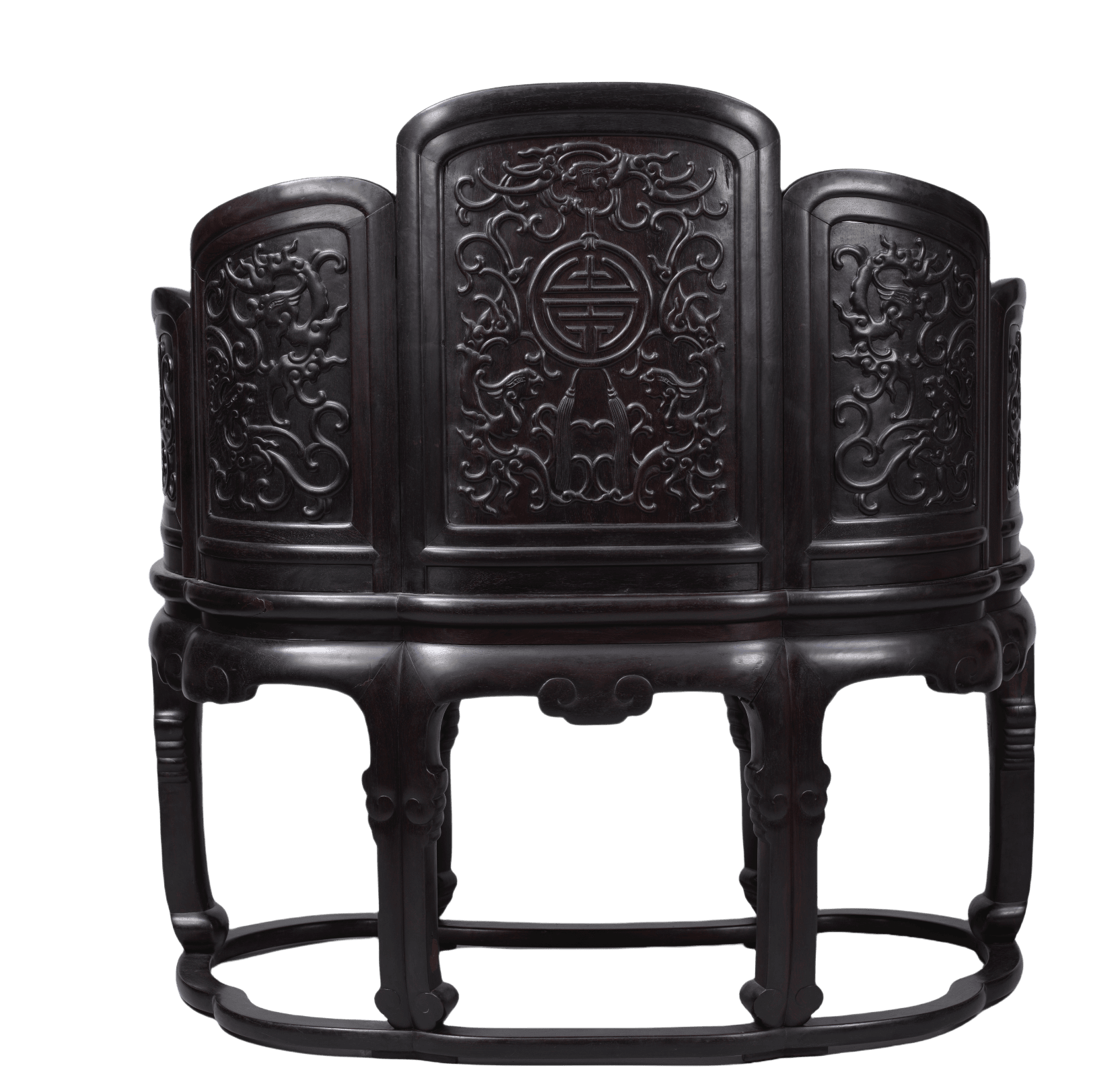 紫檀木制。宝座五屏风式,座面成腰圆形,靠背和扶手随座面形状向内环抱。攒框装芯板,双面铲地高浮雕夔凤衔团寿纹。宝座下承六条双劈料变体马蹄腿,俗称“花马蹄”,鼓腿膨牙。下承腰圆形托泥,与座面形状相应。该宝座制作用材颇费,靠背装芯、宝座腿和牙板使用从大料整挖的独板,不拼不接。