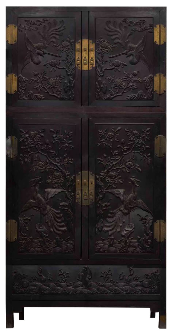 紫檀木制。一对两件。分为两部分,上部为顶箱,下部为立柜,各对开两扇门。框内落堂镶板,镶板铲地雕刻鸾凤牡丹纹,膛板上则铲地雕海水江崖纹。门框外侧各嵌铜合页四对,门间嵌铜面叶,均錾刻鱼籽地夔凤卷草纹。门下为柜膛,内有闷仓,四腿直下,方足包素铜套。此柜体量巨大,雕饰繁复,现陈设于宜芸馆。从其陈设地点以及纹饰来看,专供皇后使用,也是颐和园所藏的唯一一对紫檀凤纹顶箱柜,十分珍贵。