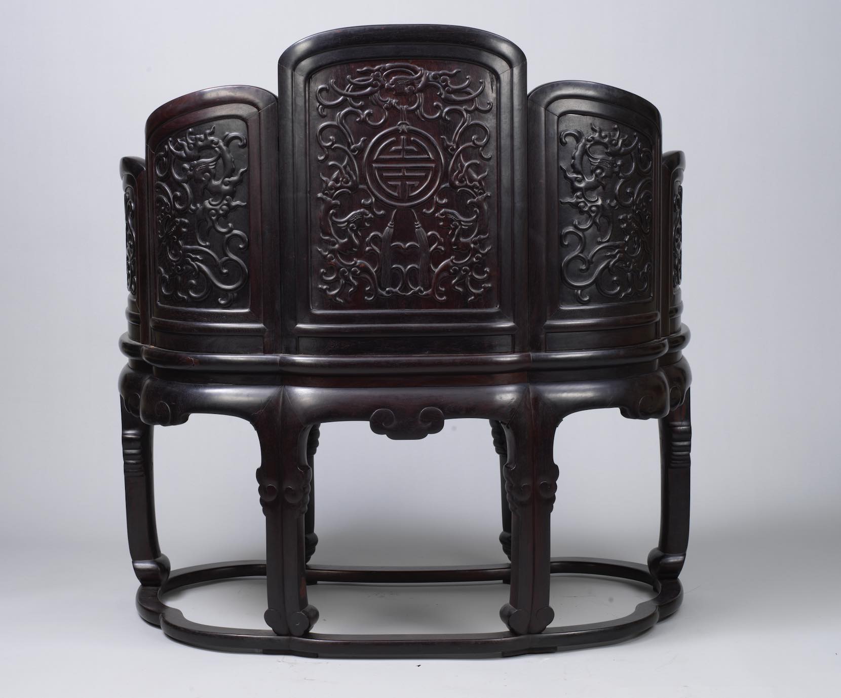 紫檀雕夔凤团寿纹五屏式有束腰带托泥宝座