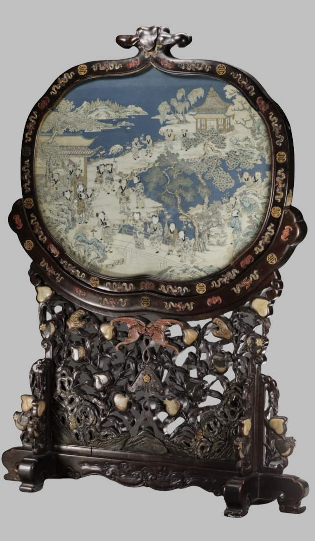 蓝地缂丝百子图石榴形插屏