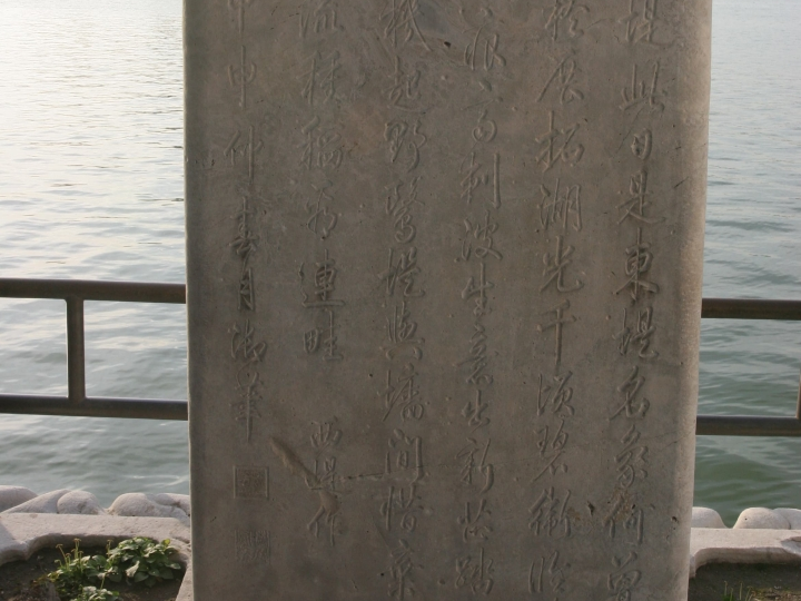 乾隆年间立。碑上所刻为乾隆皇帝的御制诗,描述的是昆明湖东堤的历史变迁。现在的昆明湖东堤曾是当年北京西郊“三山五园”之一的畅春园西墙外之护卫堤,称西堤,故诗中有“西堤此日是东堤,名象何曾定可稽”之句。