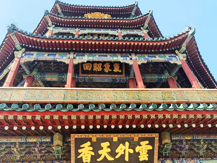 始建于清乾隆年间,一八六〇年被英法联军烧毁,光绪时按原样重建。阁结构为八面三层四重檐,通高36.44米,耸立于20米高的石造台基上,气势雄伟,是颐和园全园的构图中心。阁内供奉有铜铸金裹千手观世音菩萨站像。像高五米,重万斤,为明代万历年间所造,在八根贯通全阁上下的承重铁梨木擎天柱的衬托下,美妙庄严,熠熠生辉,有极高的文物和艺术价值。