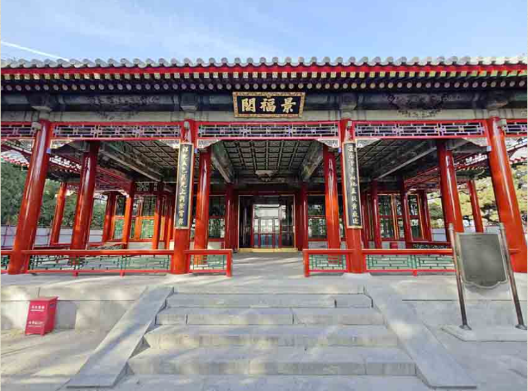 原为清漪园时期名叫昙花阁的佛殿,一八六〇年被英法联军焚毁。一八九二年改建为现在的景福阁。阁前部为宽大敞厅,慈禧太后曾在此赏月、观雨和接见外国使节。一九四九年四月,中共中央与南京国民政府的和平谈判曾在这里举行。